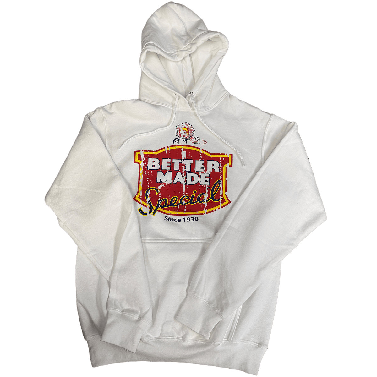 A cozy hooded sweatshirt with the vintage Better Made Snack Foods logo. S, M, L, XL, and XXL sizes are available.